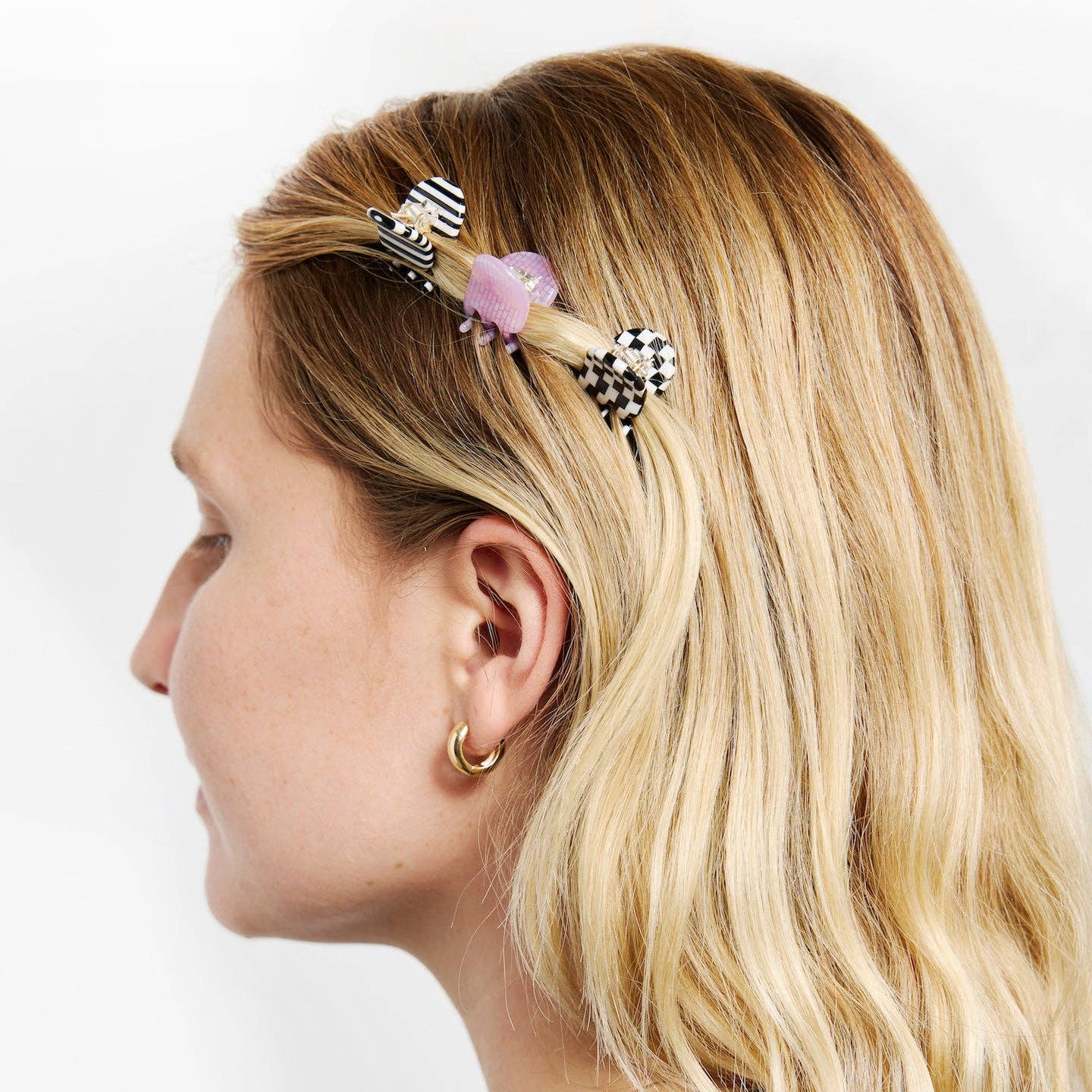 A six-pack of mighty strong, micro mini hair claws. Made from durable acetate and metal, these claws are perfect for holding back overgrown bangs and styling all types of hair.
