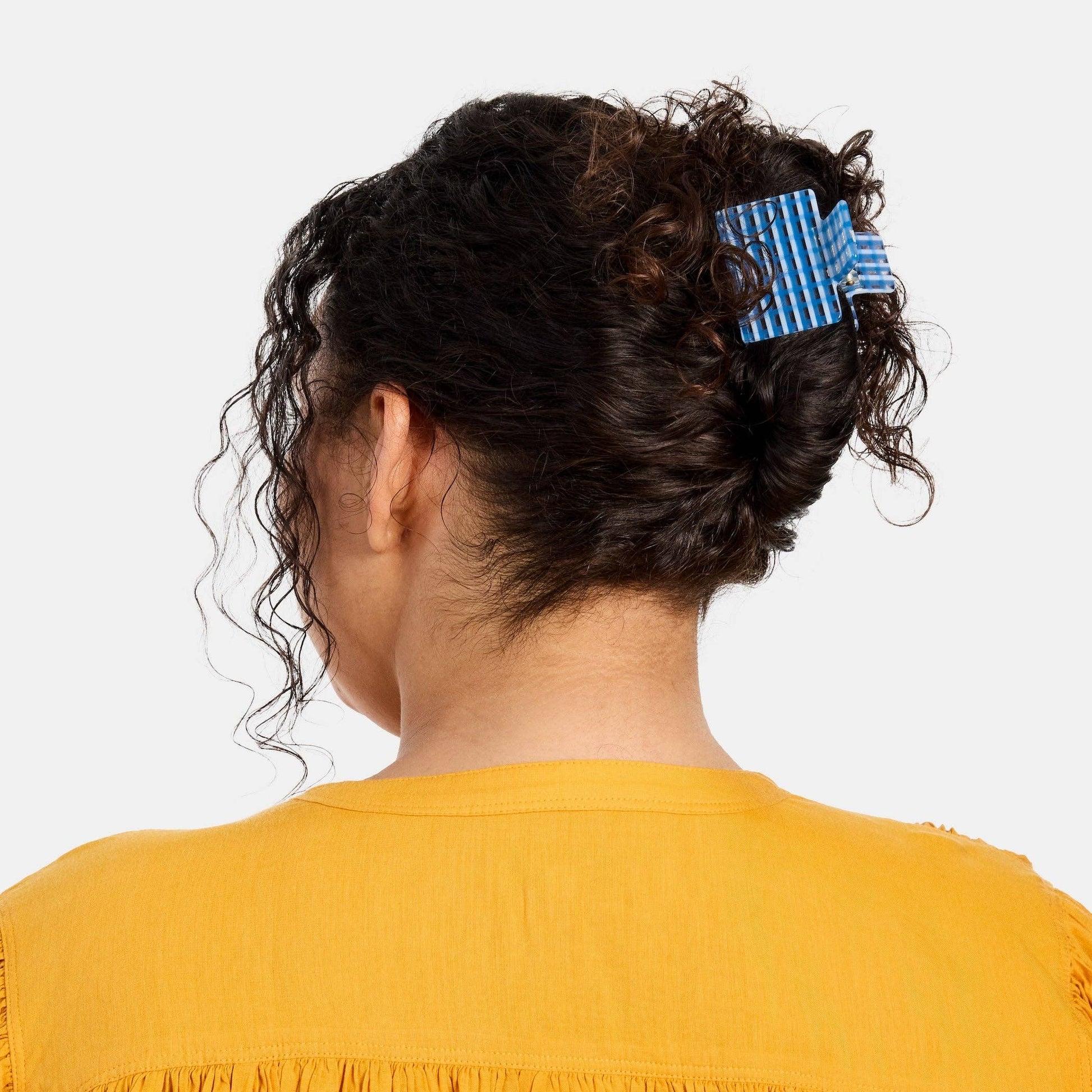 A rectangular box-shaped claw. Small-ish in size, big in grip. Clean lines but colorful. Recommended for all hair types and textures.