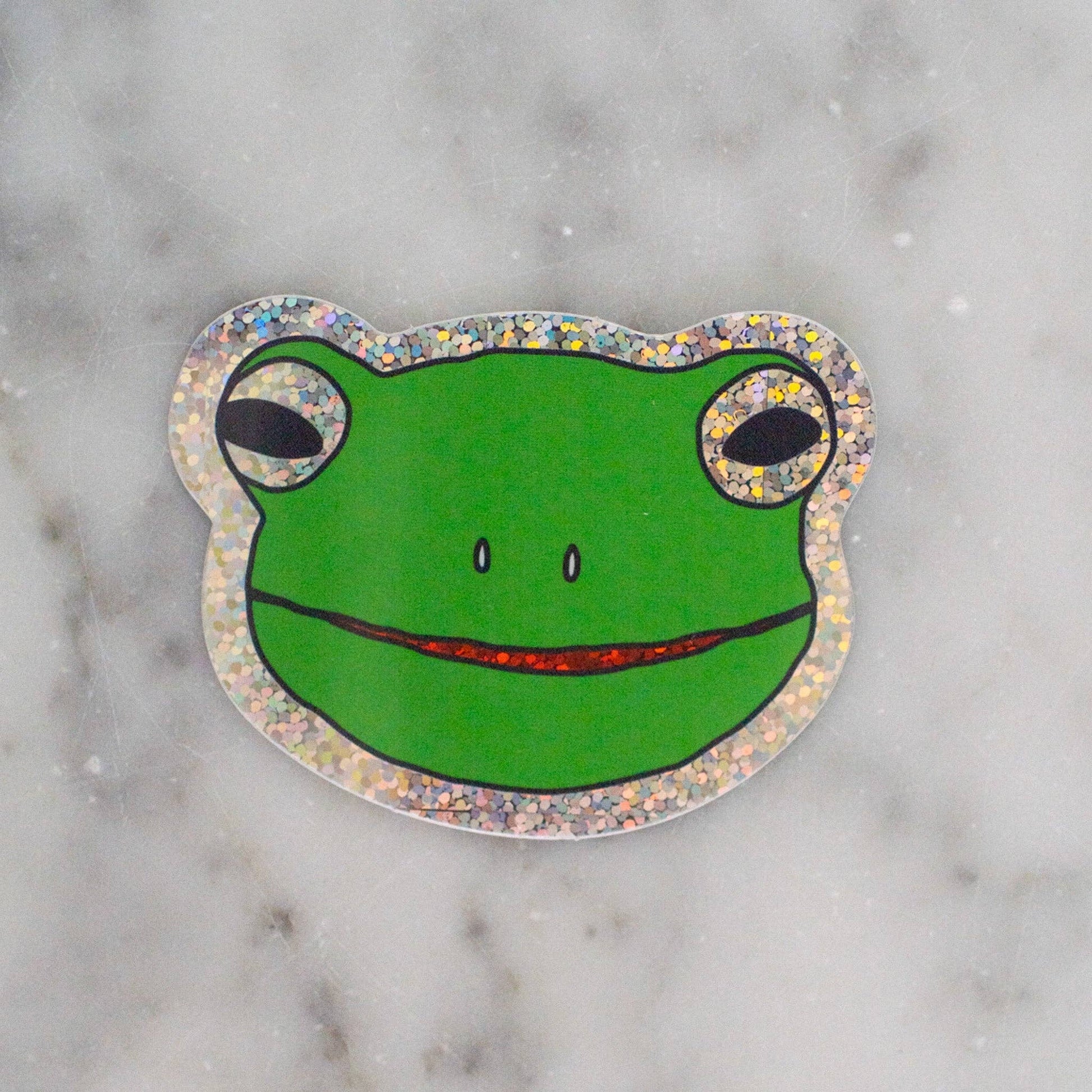 A glittery froggy face sticker that shines and sparkles with a holographic glittering effect.