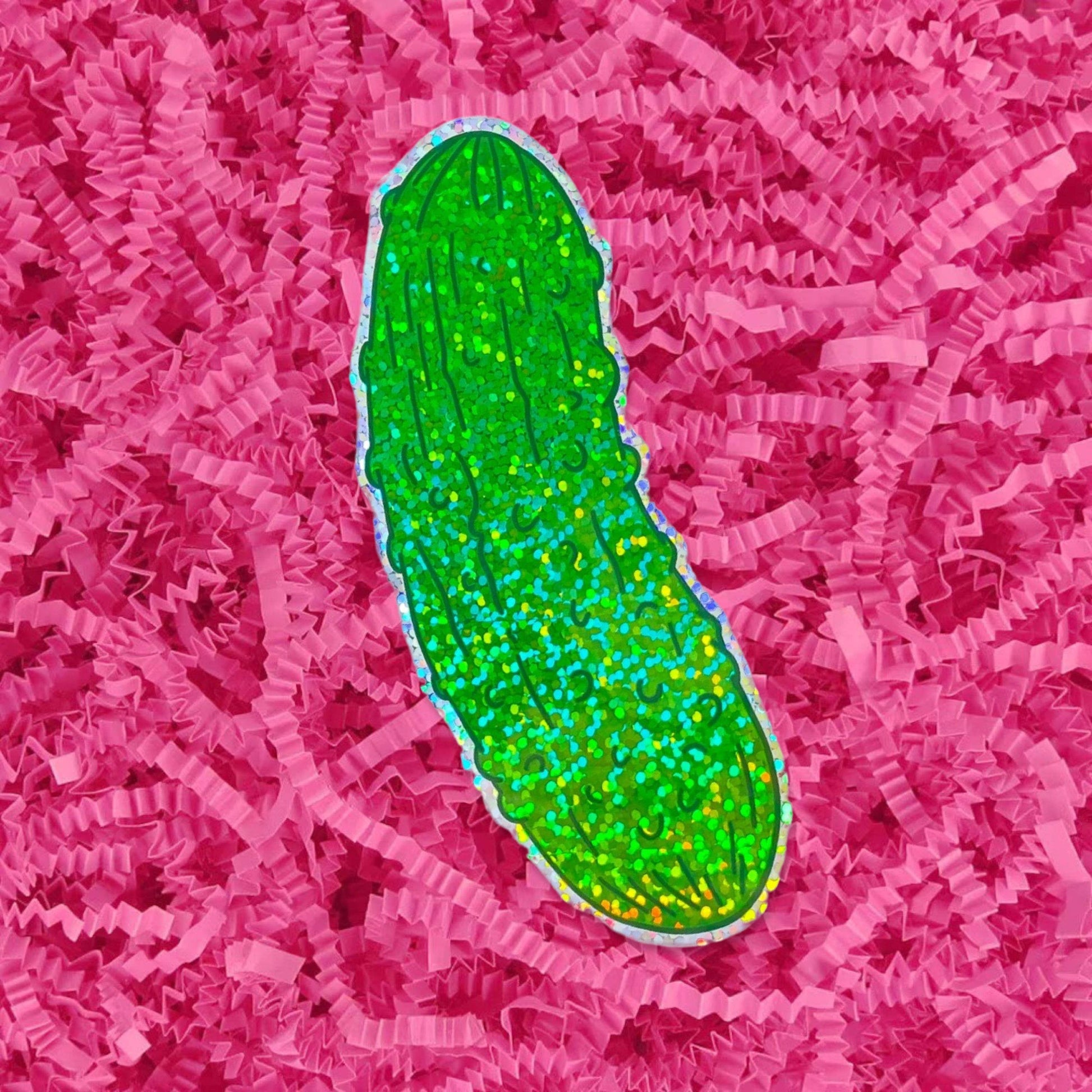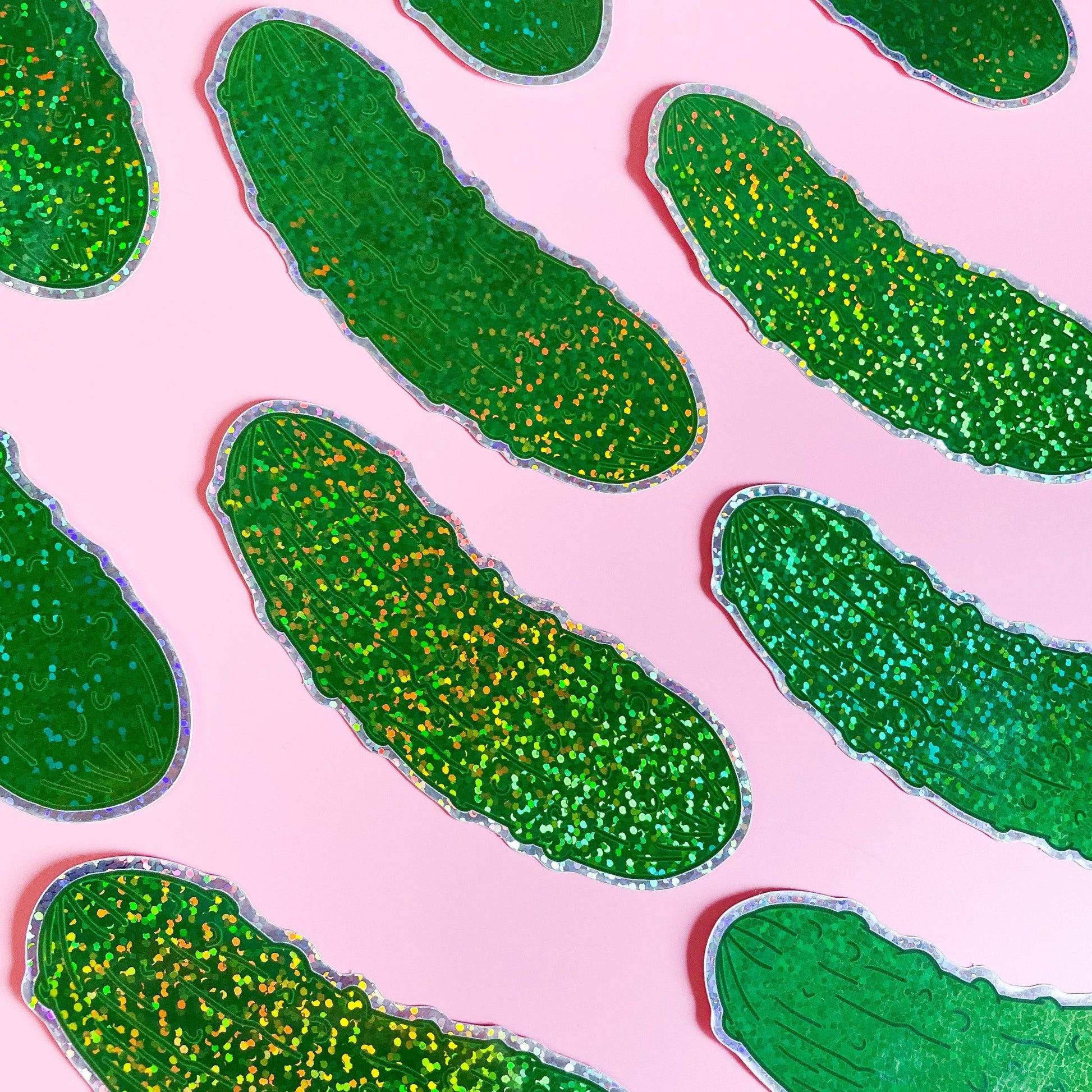 A glittery pickle sticker that shines and sparkles with a holographic glittering effect! Perfect for the pickle lover in your life.