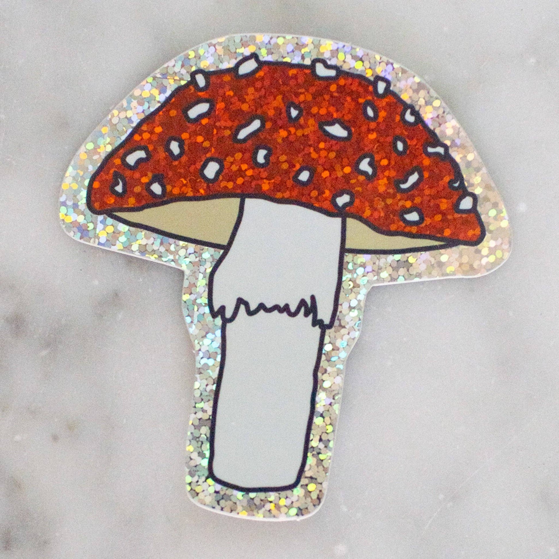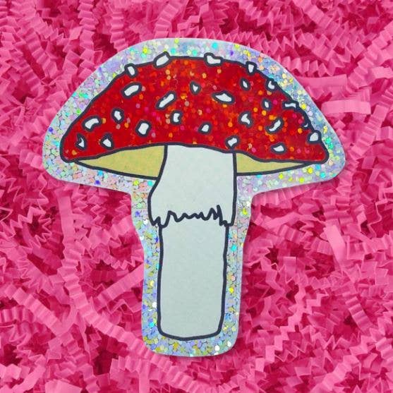 A glittery toadstool mushroom sticker that shines and sparkles with a holographic glittering effect.