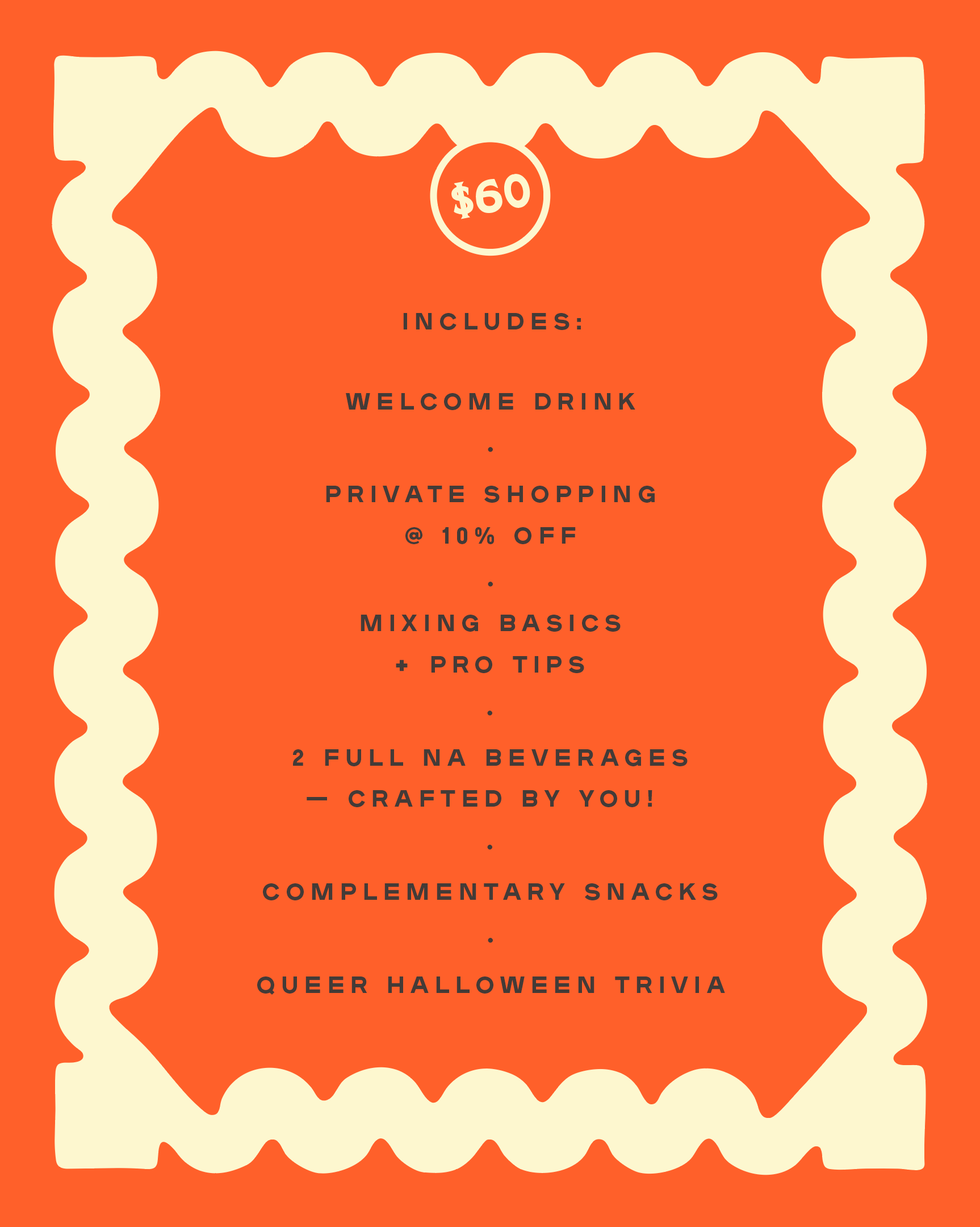 We're doing it again! Bring your boos & your besties! Elevate your NA cocktail game with Jovial & Marigold. Learn insider mixing secrets, craft two signature drinks, enjoy private shopping, show off your knowledge with queer trivia, and savor a curated snack spread. Don't miss out!