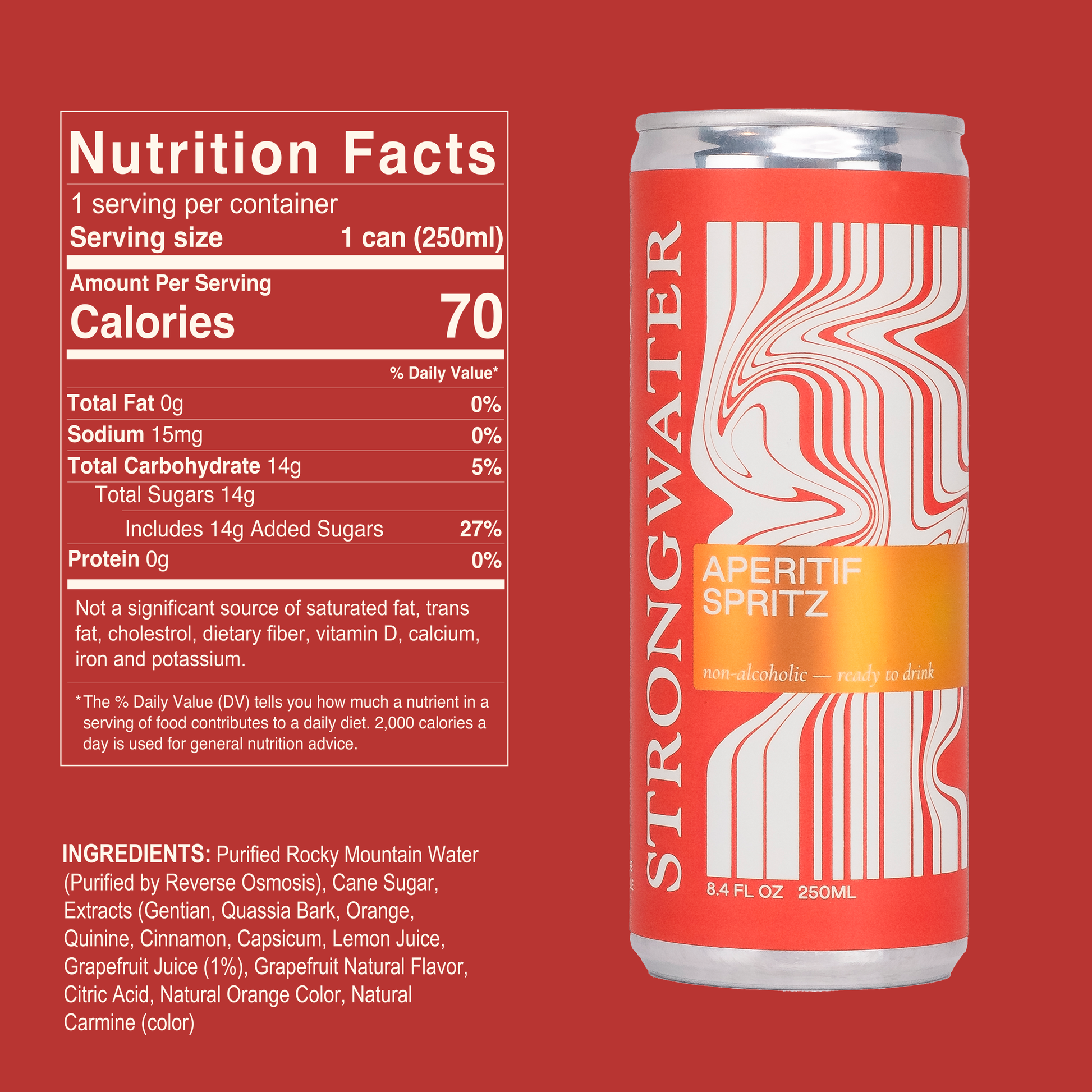 24-(250ml) cans in 4-pack tabbed cases of our our Sparkling Aperitif is made with our ultra-purified, remineralized Rocky Mountain water mixed with fresh citrus and bitter herbs to create a European-style, Alcohol-Free aperitif spritz. Think of a non-alcoholic Aperol Spritz. Sip al Fresca when you want a mental gondola ride.